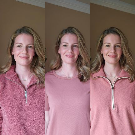 First off, let’s look at a color that DOESN’T work. This pink is way too bold for my complexion. There’s no earthiness to it, and it competes with me. I really like having a “bad” color to compare other colors with to help set a baseline.