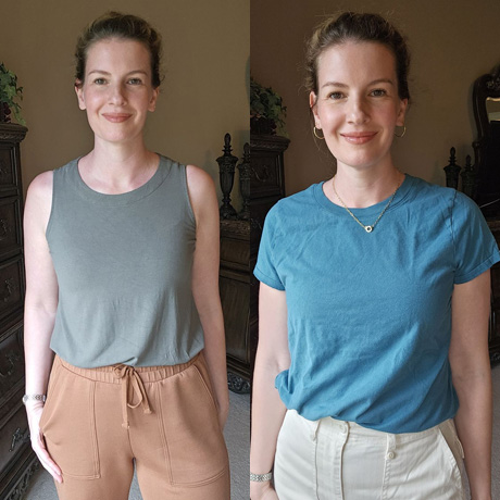 In the first photo below, I am in full soft autumn colors. My pants are quite warm in tone, and I swapped them out with an off-white pair instead. Even with my olive green top, the second look is much less autumn looking. But then I ditched the olive green top for a teal shirt, and all traces of autumn are lost (this shirt does not photograph well – it is a softer teal in real life).