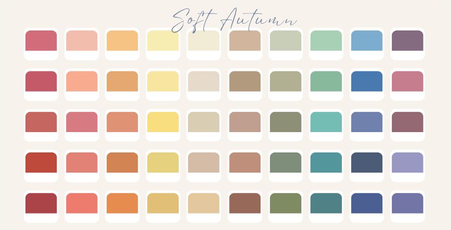 When we say “soft,” we’re talking about low chroma, which means the colors aren’t super bright or pure. Think of dusty olive, faded terracotta, warm taupe, and creamy mossy greens. The softness in these colors comes from the gray that’s subtly blended with them, but this gray isn’t an obvious thing. Instead, it appears as if the colors are dulled and mildly cooled down compared to the warmer, richer colors of Warm Autumn. This gray influence is the reason why Soft Autumn is a neutral-warm palette rather than fully warm. There’s enough gray added to dull the intensity of the colors while still hanging on to a small amount of that beautiful Autumn warmth.